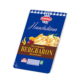 Erhältlich ist der neue Bergbaron geräuchert als Scheibenpackung hauchdünn 150 g sowie als Stück in der wiederverschließbaren 250 g Packung.
