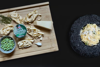 ZubereitungIn einem großen Topf Salzwasser zum Kochen bringenWährenddessen den Landfrischkäse mit dem Knoblauch in einem Mixer glatt mixenNudeln nach Packungsanleitung kochenKurz vor Ende der Kochzeit die Erbsen ins kochende Nudelwasser hinzufügenSobald die Nudeln fertig gekocht sind, gemeinsam mit den Erbsen abgießen, etwas Nudelwasser aufheben und beiseite stellenIm noch warmen Topf die Nudeln mit der Landfrischkäse-Knoblauch-Creme, geriebenem Hartkäse und etwas Nudelwasser verrührenMit Salz und Pfeffer abschmecken und mit gehacktem Schittlauch dekorieren Viel Spaß beim Zubereiten und genießen! Zubereitungsdauer15 MinutenSchwierigkeitsgradLeichtMengenangabe für2 Personen Zur Übersicht Weitere Genusstipps Mozzarella-Tomaten-Flammkuchen30 MinutenLeicht5/5 Strawberry Angel5 MinutenLeicht4/5 Mozzarella-Pops15 MinutenLeicht5/5 Mediterraner Nudelauflauf60 MinutenLeicht5/5 Gegrillte faschierte Laibchen mit Grillkäse und Paprika auf BBQ Dip 45 MinutenMittel3/5 neuHerzhafte Asmonte-Sablés mit Kräutern90 MinutenLeichtNoch keine Bewertungen