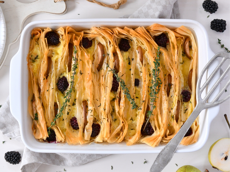 5. Schärdinger Kaisertaler und Birne in Scheiben schneiden. Die Scheiben gemeinsam mit den Brombeeren in die Zwischenräume der Teig-„Ziehharmonika“ stecken. Die Eiermischung darüber gießen und alles mit Thymianblättchen bestreuen.