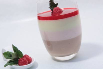 Die Masse auf drei gleichen Teilen in Schüsseln aufteilen und mit den drei verschiedenen Träumen (Vanille-, Schoko- und Erdbeertraum) vermischen. Schichtweise in hübsche Schalen oder Gläser einfüllen. Obenauf das Himbeer-Minzmark verteilen und dekorieren.