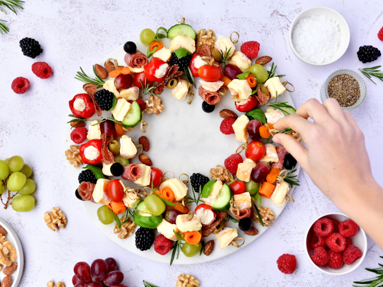 3. Die Spieße kranzförmig auf einer Servierplatte oder einem Holzbrett anrichten. Mit Rosmarinzweigen, Walnusshälften und Rauchmandeln ausdekorieren.