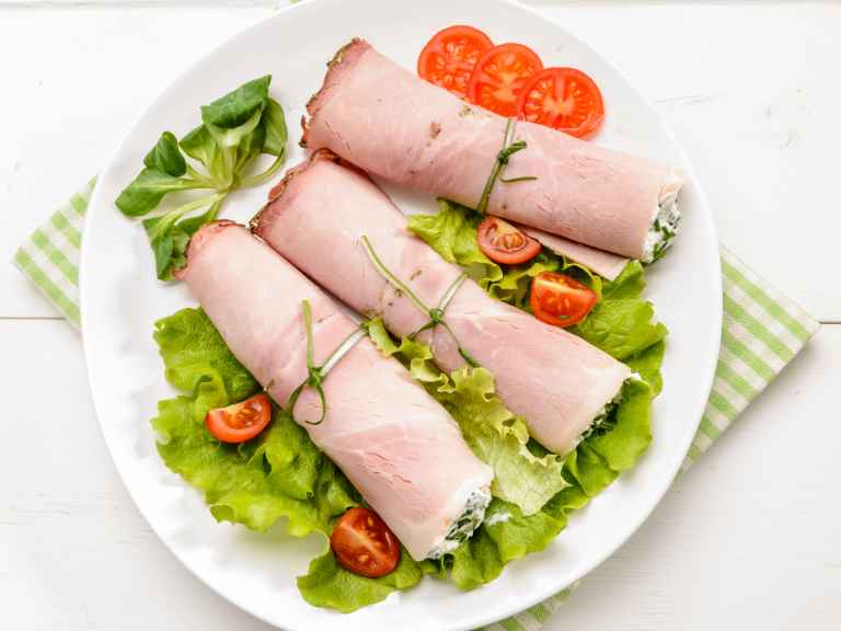 4. Pro Person drei Schinkenröllchen auf Tellern anrichten, mit Salatblättern und Cocktailtomaten garnieren.