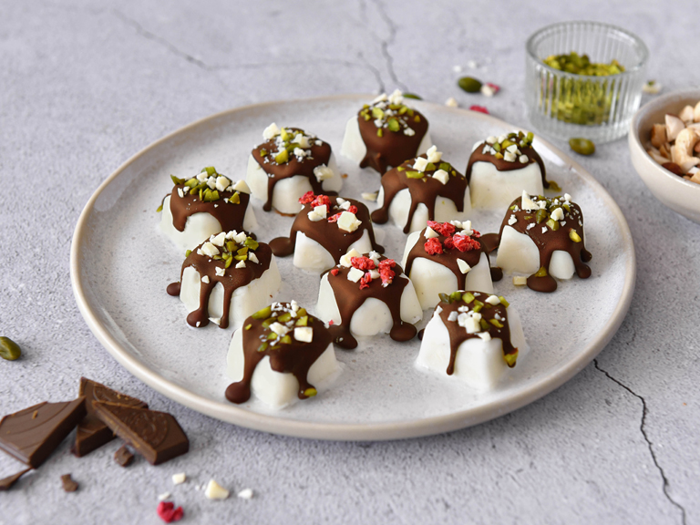 Die gefrorenen Joghurthäppchen einzeln in die Schokolade tauchen oder mit dem Löffel übergießen, auf Backpapier oder Teller legen und sofort mit beliebigen Toppings bestreuen.