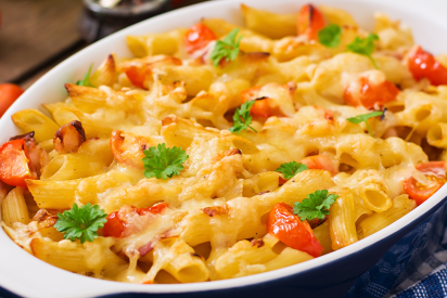 Jetzt die Tomaten darüber verteilen, den Käse aufstreuen und im vorgeheizten Backrohr ca. 35 Minuten backen. Tipp: Am besten eine Nudel herausfischen, um zu prüfen, ob sie al dente ist.