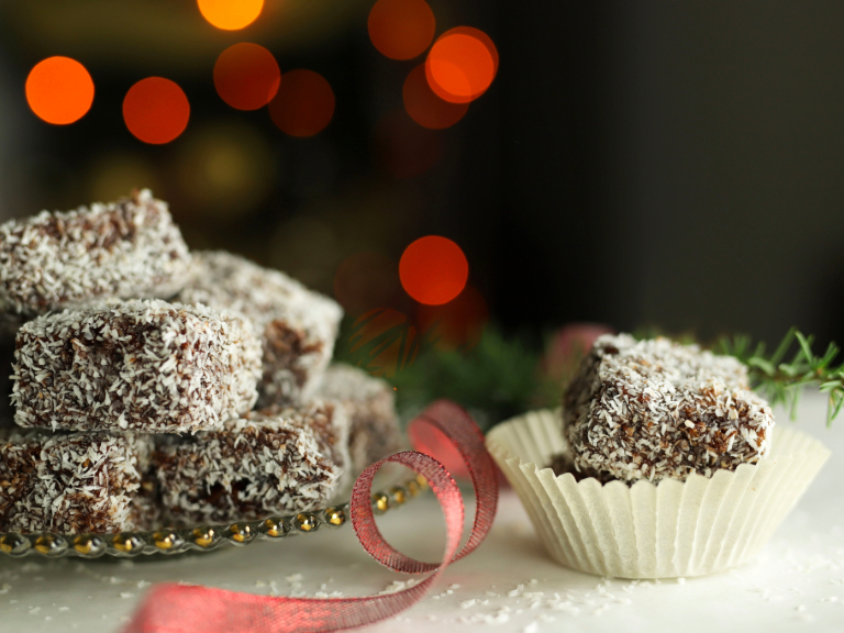 6. Die Teigwürfel zunächst vollständig in die Glasur tauchen, dann etwas abtropfen lassen und rundherum in den Kokosflocken wälzen. Auf einem Kuchengitter trocknen lassen.