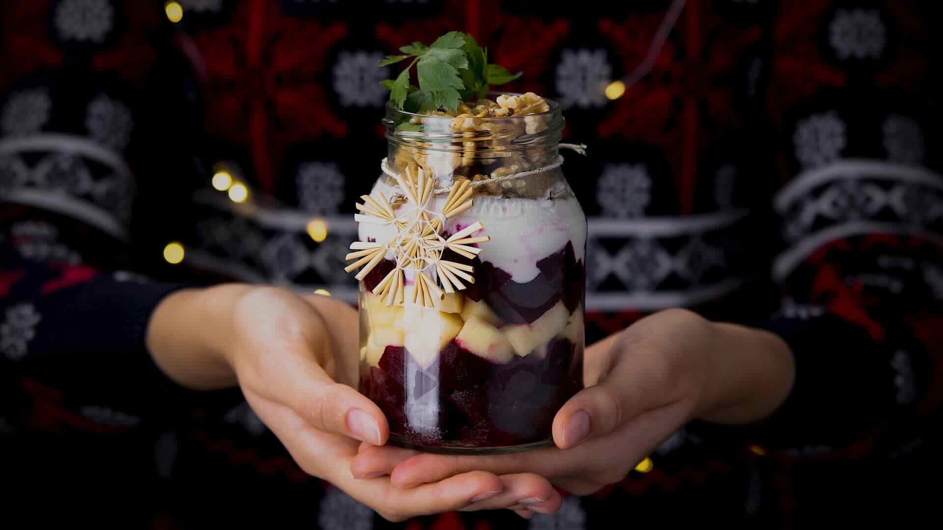 Salat, Dressing, Walnüsse und Kräuter abwechselnd im Glas schichten.