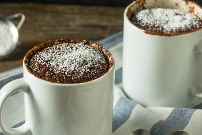 Den Teig in zwei mikrowellengeeignete Tassen füllen und die Tassenküchlein für 1-1,5 Minuten (je nach Leistung der Mikrowelle) in der Mikrowelle backen.